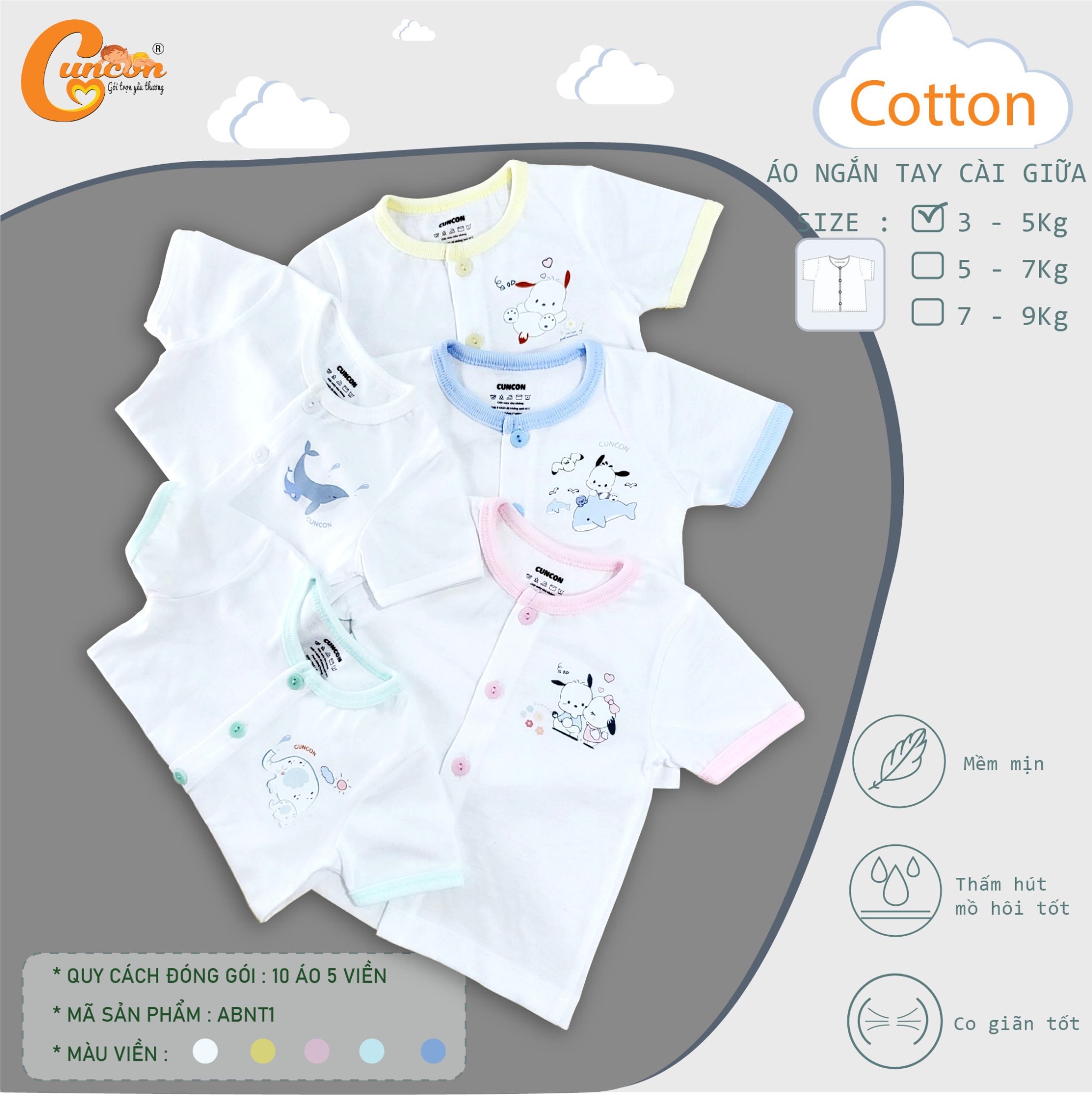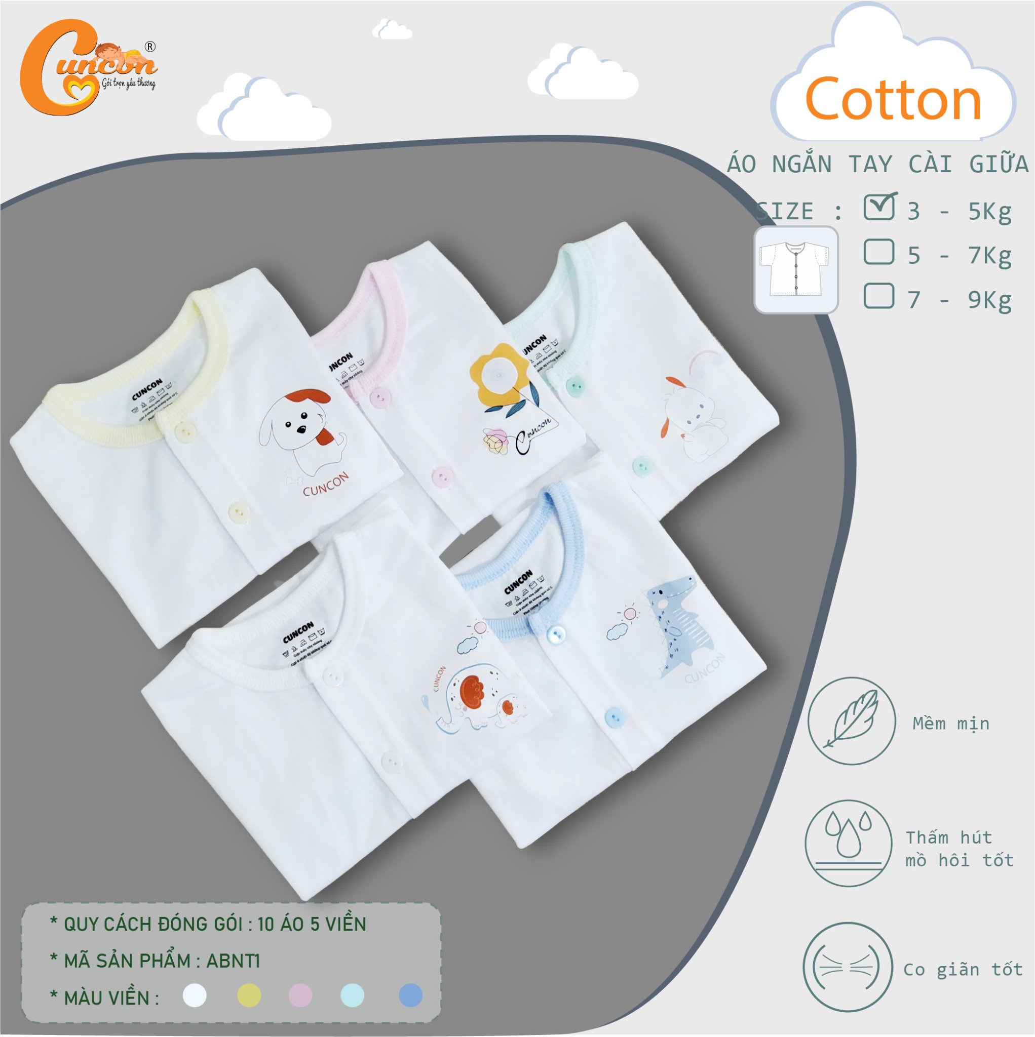 Được may từ thành phần cotton cho bé thấm hút mồ hôi, thoải mái vận động. Chất liệu : vải cotton, thấm hút mồ hôi, nhẹ nhàng & thoáng mát, không gây kích ứng da cho bé, có khả năng thấm hút mồ hôi cực tốt, rất thích hợp với kiểu thời tiết nóng bức ở Việt Nam. - Kiểu dáng: in hình ngẫu nhiên. Màu sắc và họa tiết đáng yêu. - Dễ dàng vệ sinh mà không sợ ảnh hưởng đến chất lượng sản phẩm Sản phẩm cho bé từ 0 - 6 tháng Bảo quản sản phẩm - Không được dùng chất tẩy trắng khi giặt loại vải này - Không nên sử dụng nhiệt cao từ các loại máy sấy. - Nên giặt bằng tay để giữ độ bền và khả năng mềm mại của nó. Thương hiệu : Cuncon Xuất xứ : Việt Nam